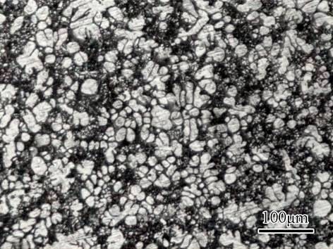 (1)采用滚筒搅拌方法制备了ADC12、A356等多种铝合金半固态浆料,并应用流变压铸技术对其进行半固态成形,研究了半固态浆料的温度和固相率、压铸机冲头的压射速率和压力、压铸机压射室温度以及模具润滑等工艺对成形零件组织与性能的影响,得到了优化的流变压铸参数。流变压铸ADC12铝合金组织见下图1。