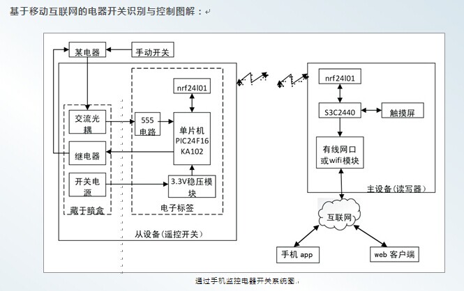 随着社会经济水平的发展,人们越来越追求舒适、便捷的生活方式,对电器开关的要求也趋向于智能化、自动化,随即涌现出了各种各样电器开关,如声控开关、光控开关、延时开关、遥控开关等等,然而这些开关都是近距离的控制,当人在附近,通过各种方式控制开关动作,连接在开关上的电器状态随即发生变化,这些变化是能够及时被人感知到的,因此近距离的开关控制无须要“监视”;但是,当对电器开关进行远程网络控制时就出现了一个新问题,即触发控制开关后,人不在现场,遥控连接的开关是否真正动作了?不得而知;还有在办公室或者家居的场合,当人们出差在外或者离开了办公室以后,需要知道一些重要电器(如空调)开关的状态,能够确认电源开关的关闭状态,以避免天气等环境变化引起电器的损坏;家居或者办公环境,一般都会有较多的电器开关节点,如何识别和区分?可见网络遥控的电器开关不但需要控制,还需要识别和监视,做到真正的监控,才能够增加这种遥控开关的实用性。能够实现对电器开关网络监控是本产品的一大特色。